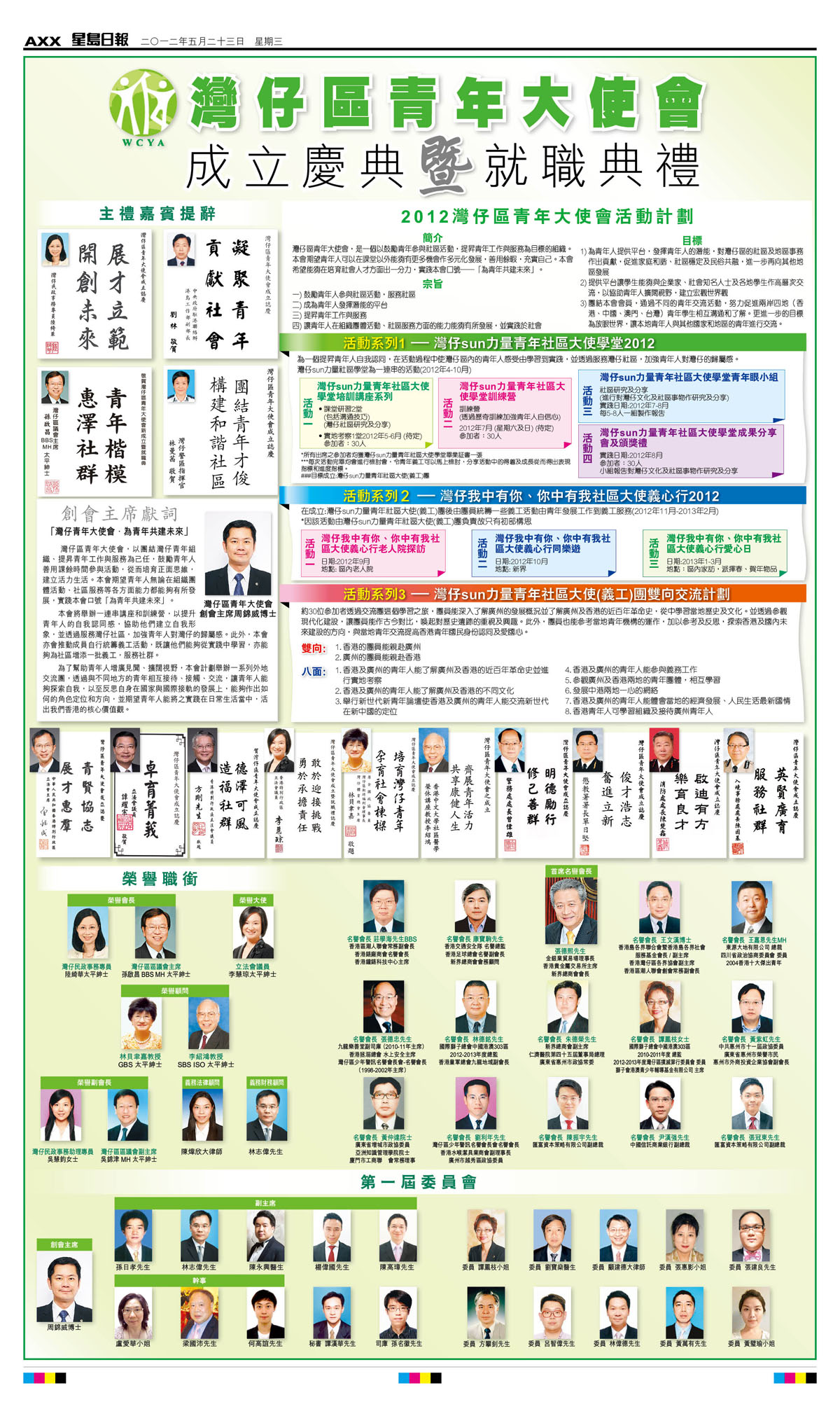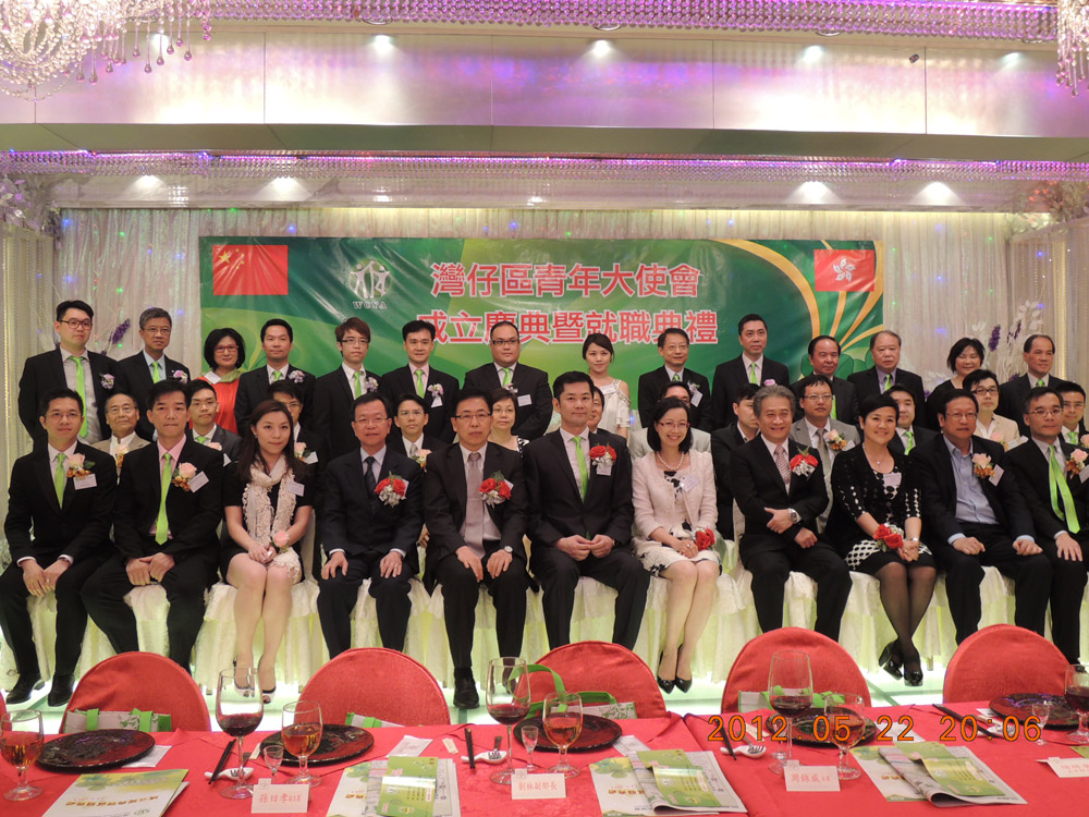 2012年5月23日 晚上灣仔區青年大使會於銅鑼灣「百樂門宴會廳」舉行之「成立慶典 暨 就職典禮」當晚共34席, 是次活動得到灣仔民政事務專員,中聯辨副部長,灣仔區議會主席,灣仔警區指揮官擔任大會主禮嘉賓,本會更送出多份名禮物 其中包括Iphone手機一部,當日更印製全版報章祝賀,場面熱鬧。 |